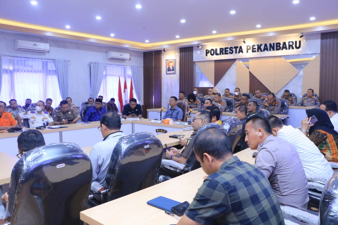 Indra Pomi Nasution bersama Forkopimda Pekanbaru mengikuti rapat, di Aula Bunga Kiambang Polresta Pekanbaru. Mereka membahas sejumlah persiapan jelang Hari Raya Idulfitri.