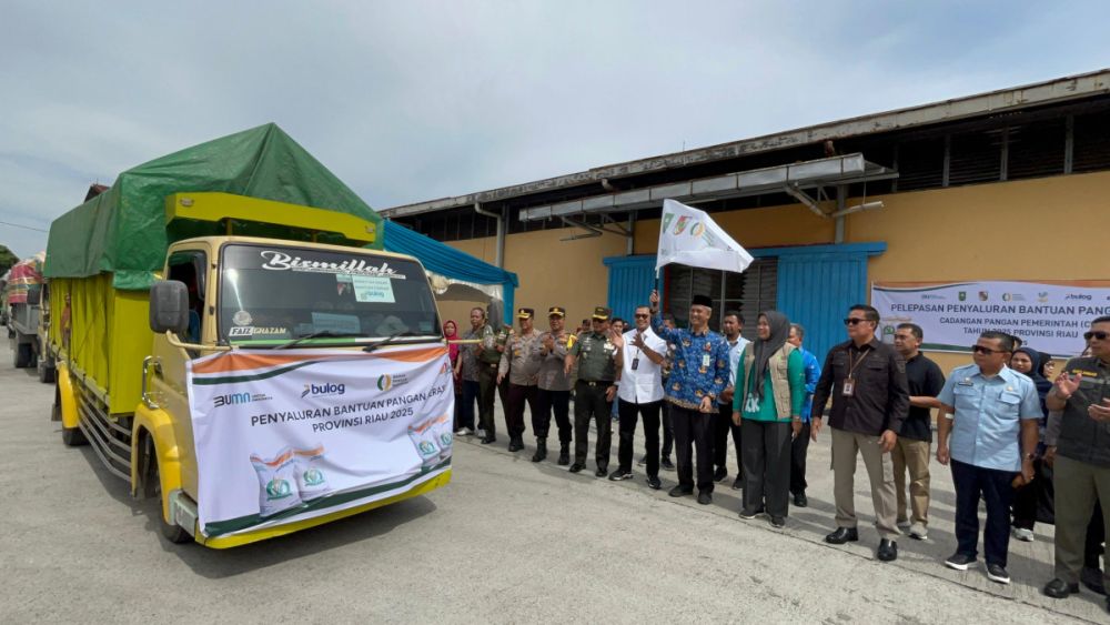 Sebanyak 52.340 kilogram beras bantuan pangan Cadangan Pangan Pemerintah (CPP) mulai disalurkan kepada warga kurang mampu di tiga kecamatan di Kota Pekanbaru, Kamis (17/7/2025). Pelepasan rombongan truk pengangkut beras dilakukan dari Gudang Bulog Jalan Jenderal Sudirman.