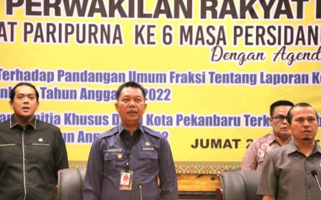 Sekda Kota Pekanbaru Indra Pomi Nasution mewakili Pj Walikota Pekanbaru Muflihun menyampaikan ucapan terima kasih atas masukan dan pandangan dari seluruh fraksi yang ada di DPRDKota Pekanbaru.
