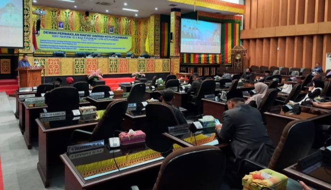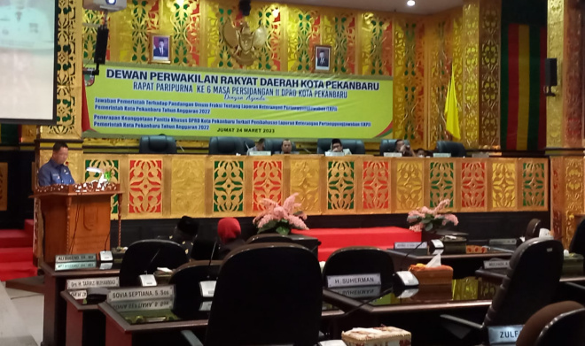 PEKANBARU – DPRD Kota Pekanbaru menggelar Rapat Paripurna Jawaban Pemerintah terhadap Pandangan Umum Fraksi tentang Laporan Pertanggungjawaban (LKPj) Kota Pekanbaru Tahun Anggaran 2022, Jumat (24/3/2023).