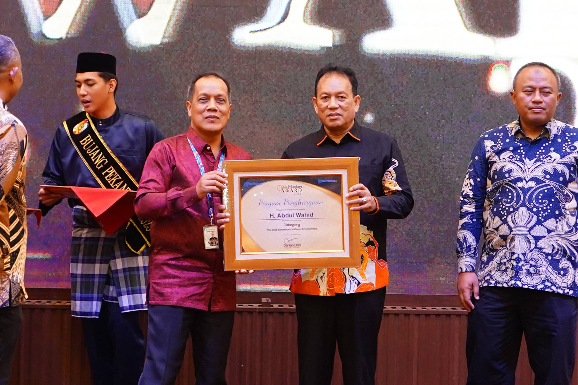 Gubernur Riau (Gubri) Abdul Wahid, meraih penghargaan The Best Governor in Green Environment dalam ajang Tribun Pekanbaru Award 2025 yang digelar di Hotel Grand Elite Pekanbaru, Rabu (27/8/2025) malam. Penghargaan ini diberikan sebagai bentuk apresiasi terhadap komitmen dalam menjaga kelestarian lingkungan hidup dan pembangunan berwawasan hijau.