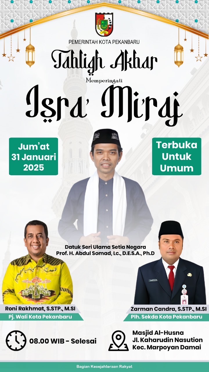 Penjabat (Pj) Walikota Pekanbaru Roni Rakhmat S.STP M.Si melalui Pelaksana Harian (Plh) Sekdako Pekanbaru Zarman Candra S.STP M.Si menyebutkan, Isra Mikraj nanti akan menghadirkan Ustadz Prof H Abdul Somad LC D.E.SA Ph.D atau UAS. Peringatan Isra Mikraj nanti, terang Zarman Candra, dipusatkan di Masjid Al-Husna di Jalan Kaharuddin Nasution, Kecamatan Marpoyan Damai.