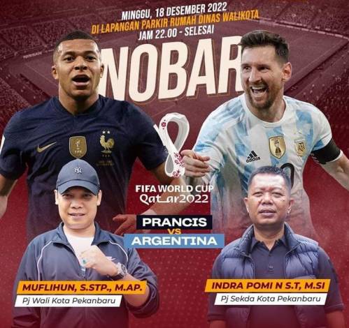 Warga Pekanbaru diajak meramaikan nonton bareng (Nobar) final piala dunia 2022 antara Argentina vs Prancis bersama Penjabat (Pj) Walikota Pekanbaru Muflihun dan Pj Sekda Pekanbaru Indra Pomi Nasution pada Minggu (18/12/2022) malam.