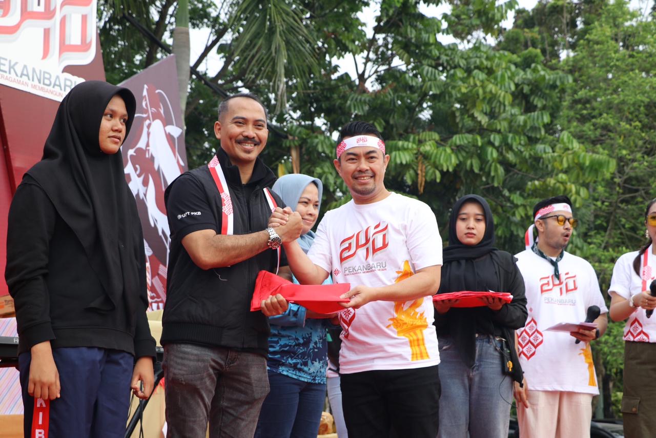 Penjabat (Pj) Wali Kota Pekanbaru Risnandar Mahiwa membagikan secara simbolis bendera Merah Putih ke warga di lapangan Mal Pelayanan Publik, Minggu (2/6/2024). Bendera Merah Putih ini dibagikan bersempena acara Fun Walk dan peluncuran logo HUT ke-240 Pekanbaru. Usai melepas peserta Fun Walk atau jalan santai, Pj Wali Kota Risnandar membagikan bendera Merah Putih ke warga di area CFD.
