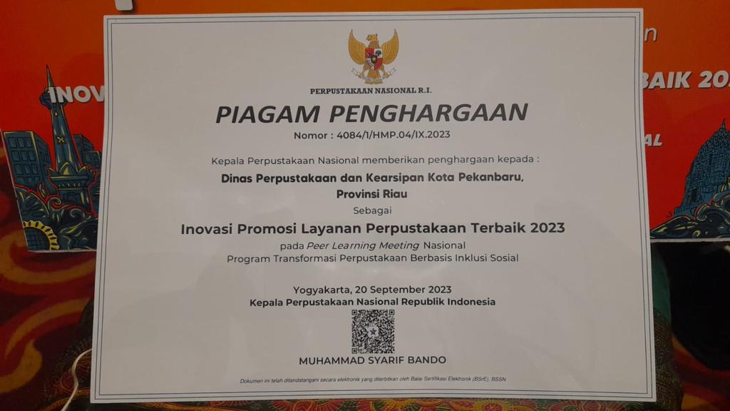 Pemerintah Kota (Pemko) Pekanbaru melalui Dinas Perpustakaan dan Kearsipan menerima penghargaan sebagai Dinas Perpustakaan Kabupaten/Kota dengan Inovasi Promosi Layanan Perpustakaan Terbaik 2023 saat pelaksanaan peer learing meeting (PLM) nasional 2023 di Yogyakarta, Kamis (21/9).