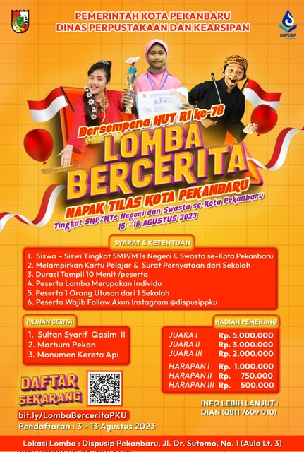 Perpustakaan Tenas Effendy Kota Pekanbaru menggelar gerakan budaya gemar membaca dalam rangka Hari Ulang Tahun (HUT) Kemerdekaan Republik Indonesia ke-78. Pengelola pun menggelar Lomba Bercerita Tingkat SMP/MTs Negeri dan Swasta se-Kota Pekanbaru.