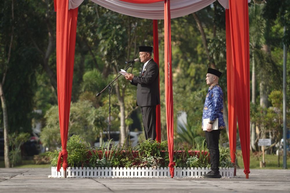 Pj Sekdaprov Riau, Taufiq OH, menerangkan pentingnya sinergi yang kuat antara pemerintah pusat dan daerah dalam menghadapi tantangan pembangunan nasional. Hal tersebut disampaikannya saat melaksanakan apel peringatan Hari Otonomi Daerah (Otda) ke-XXIX di Halaman Kantor Gubernur Riau, Kota Pekanbaru, Jumat (25/04/2025) pagi.