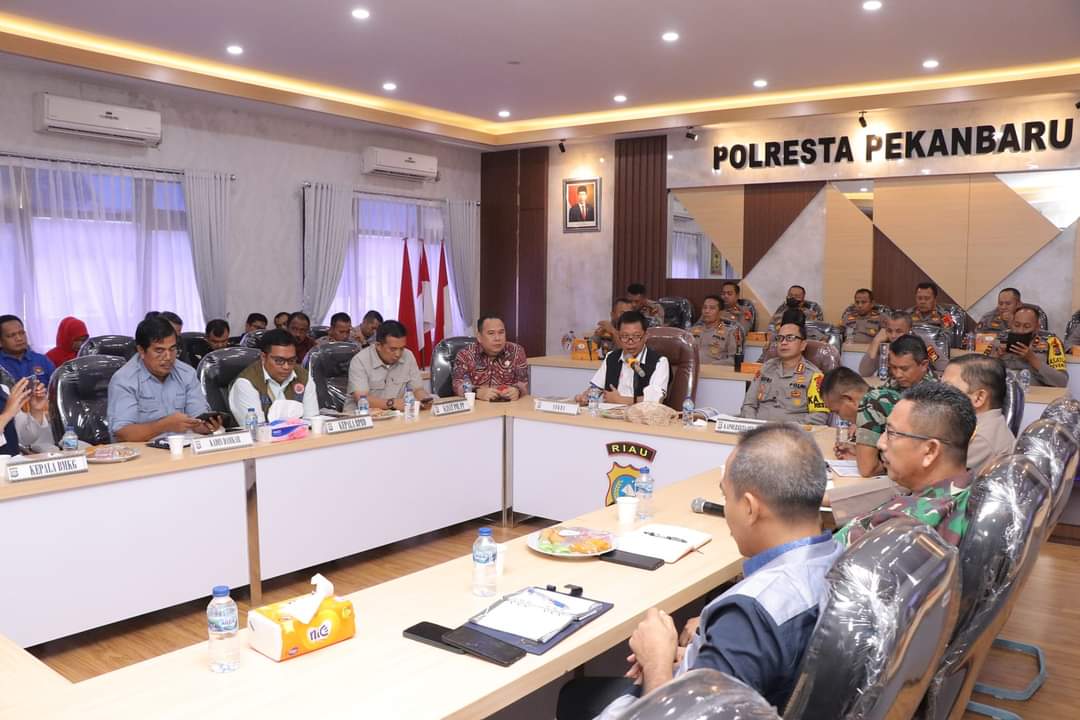 Pj Walikota Pekanbaru Muflihun, S.STP M.AP, diwakili Sekretaris Daerah Indra Pomi Nasution memimpin rapat koordinasi terkait penanganan bencana di Kota Bertuah. Kegiatan berlangsung di Aula Bunga Kiambang Polresta Pekanbaru, Sabtu (29/4).