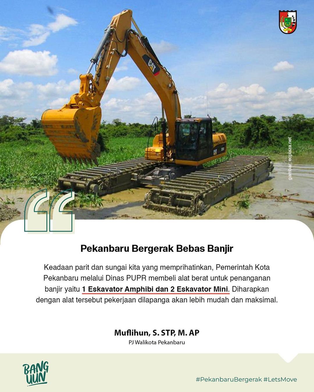 Ditambahkannya, Excavator Amphibi sangat diperlukan untuk melakukan sungai-sungai besar seperti Sungai Sail. Normalisasi sungai Sail dilakukan bertahap. Arahan Penjabat (Pj) Wali kota, sungai Sail itu harus dikeruk menggunakan ekskavator amfibi.