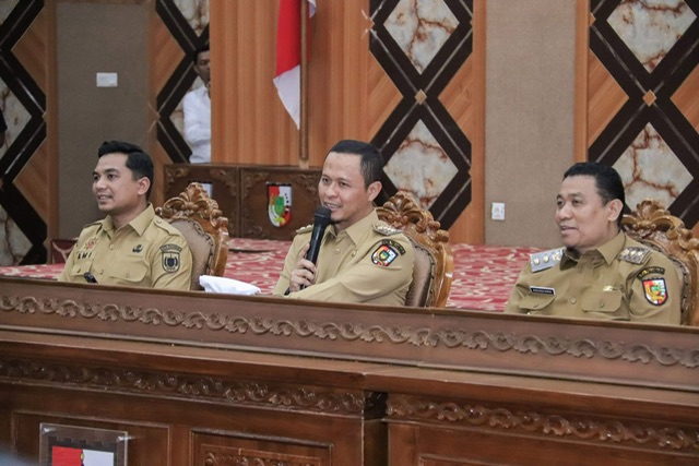 Wali Kota Pekanbaru Agung Nugroho, langsung membahas sejumlah permasalahan kota pada hari pertama berkantor di Komplek Perkantoran Pemerintah Kota Pekanbaru, Tenayan Raya, Senin (3/3/2025). Ia mengumpulkan seluruh kepala Organisasi Perangkat Daerah (OPD) dalam rapat di Ballroom lantai enam Gedung Utama Komplek Perkantoran Pemerintah Kota Pekanbaru.